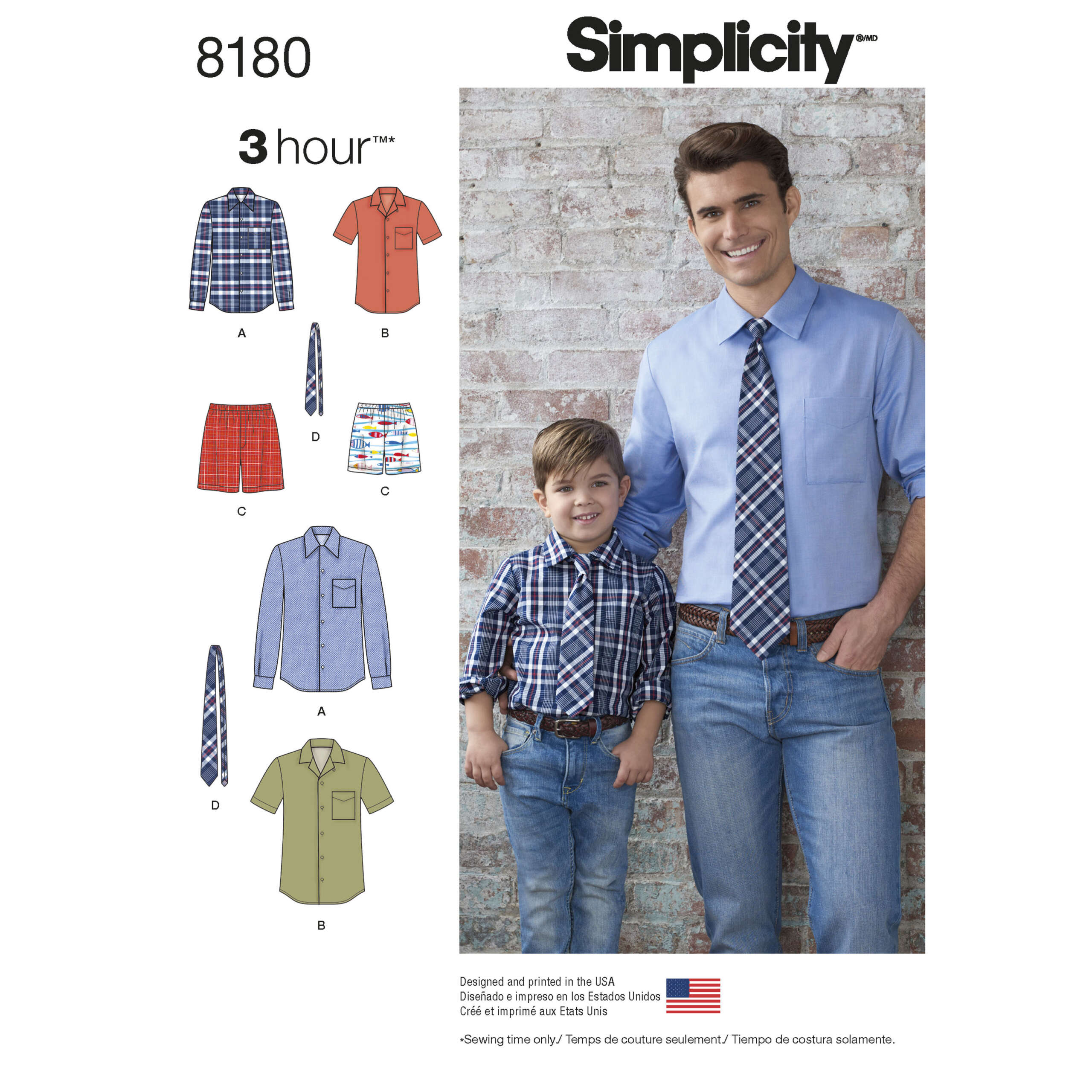 Get these essential pieces for boys and men in this 3 Hour sewing pattern including short or long sleeve collared shirt with chest pocket, boxer shorts with elastic waist, and tie. This pattern is great for coordinating or matching outfits.