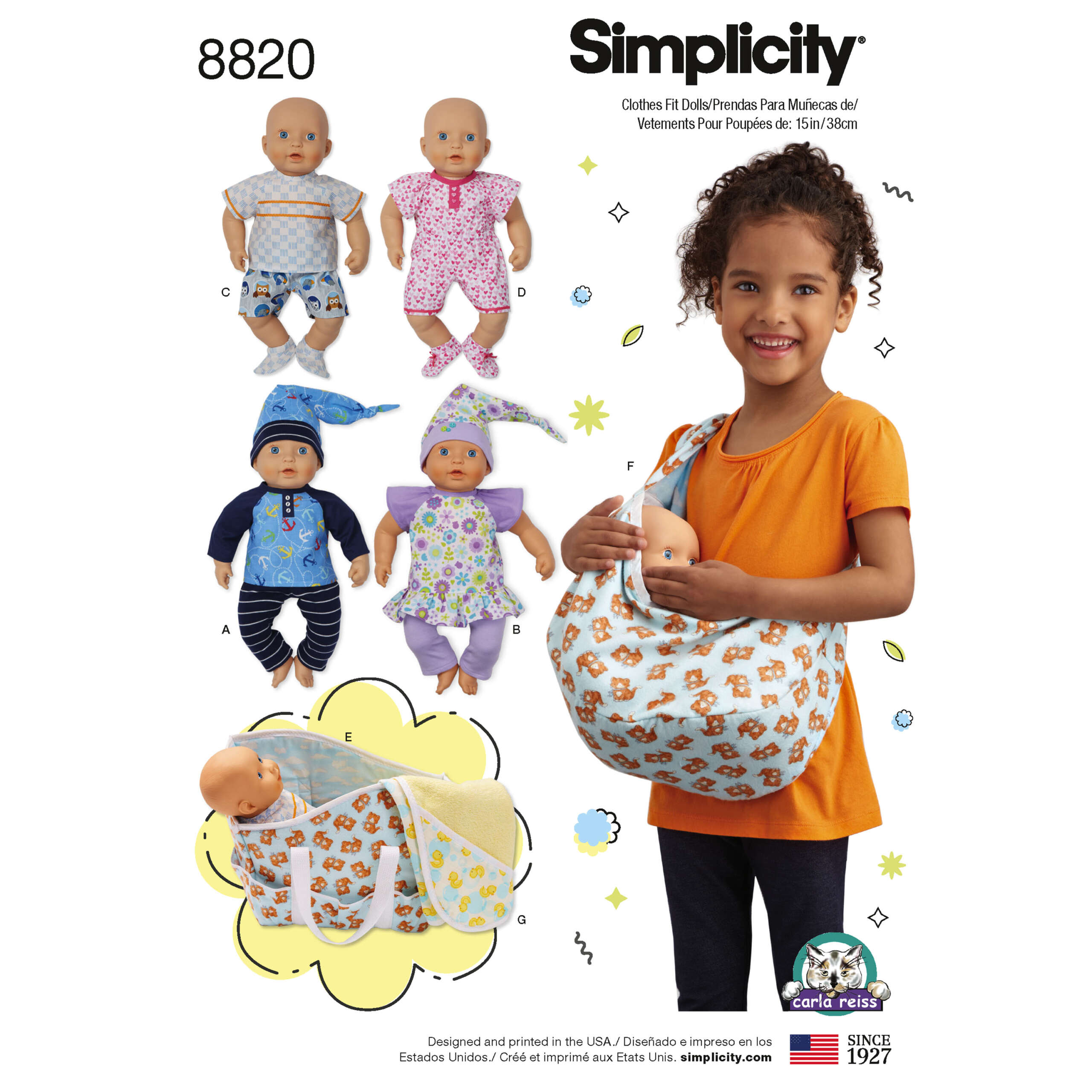 Cute and adorable clothes and accessories for your 15″ baby doll. Includes tops, bottoms, romper, hat, booties, bag, sling and blanket. Carla Reiss for Simplicity.